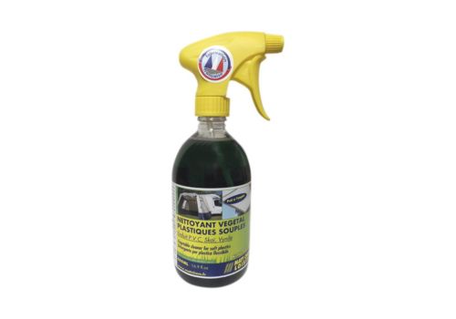 2. Application du nettoyant : Pulvérisez une solution douce et laissez agir quelques minutes pour décoller la saleté. Nous vous recommandons : le nettoyant végétal pour plastique souple