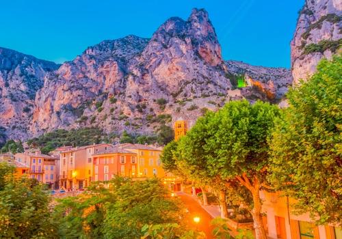 En direction du Verdon, faites escale à Moustiers-Sainte-Marie, classé parmi les "Plus Beaux Villages de France". Suspendu entre deux falaises, ce village est célèbre pour son étoile dorée suspendue dans le vide et sa faïence.