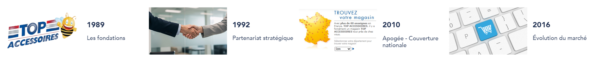 • 2010 - Apogée / Couverture nationale. TOP ACCESSOIRES s'impose comme leader du réseau physique français. Constitution du premier réseau national avec près de 60 magasins répartis sur le territoire, positionnant TOP ACCESSOIRES comme leader offline des accessoires camping-car.