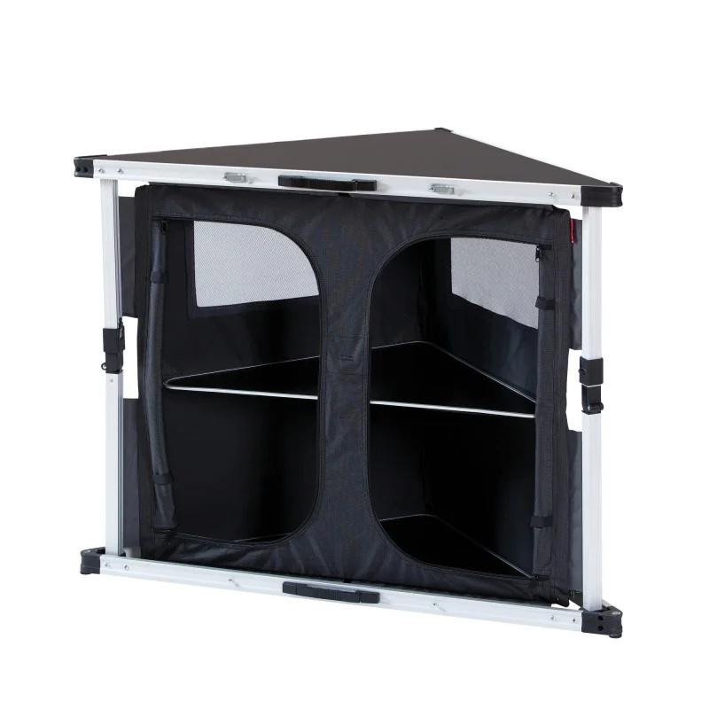 Le Meuble d’Angle Isabella s’adresse aux campeurs soucieux d’optimiser chaque mètre carré sous leur auvent. Grâce à sa forme triangulaire, il se glisse parfaitement dans un angle inutilisé, libérant de la place au sol et rendant l’organisation plus fluide.